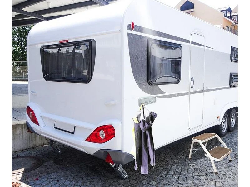 De kunststof kapstok kan eenvoudig in de rail van de caravan worden bevestigd. De 4 haken bieden voldoende ruimte voor uw jassen, theedoeken etc.